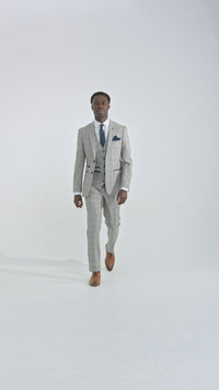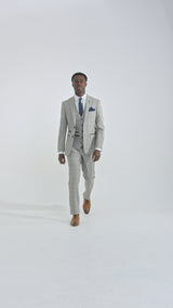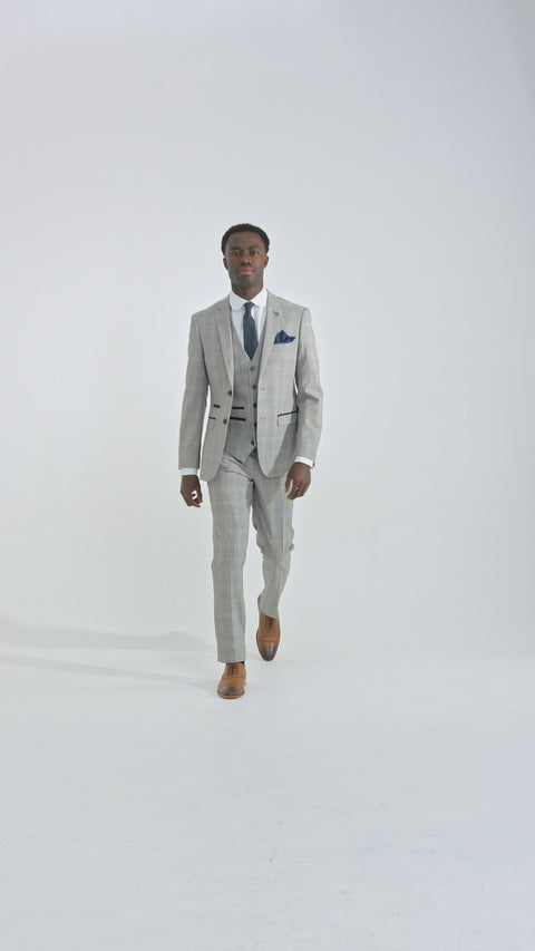 Hugo Herrenanzug, hellgrau, dreiteilig, mit marineblauem Karomuster und Samtbesatz